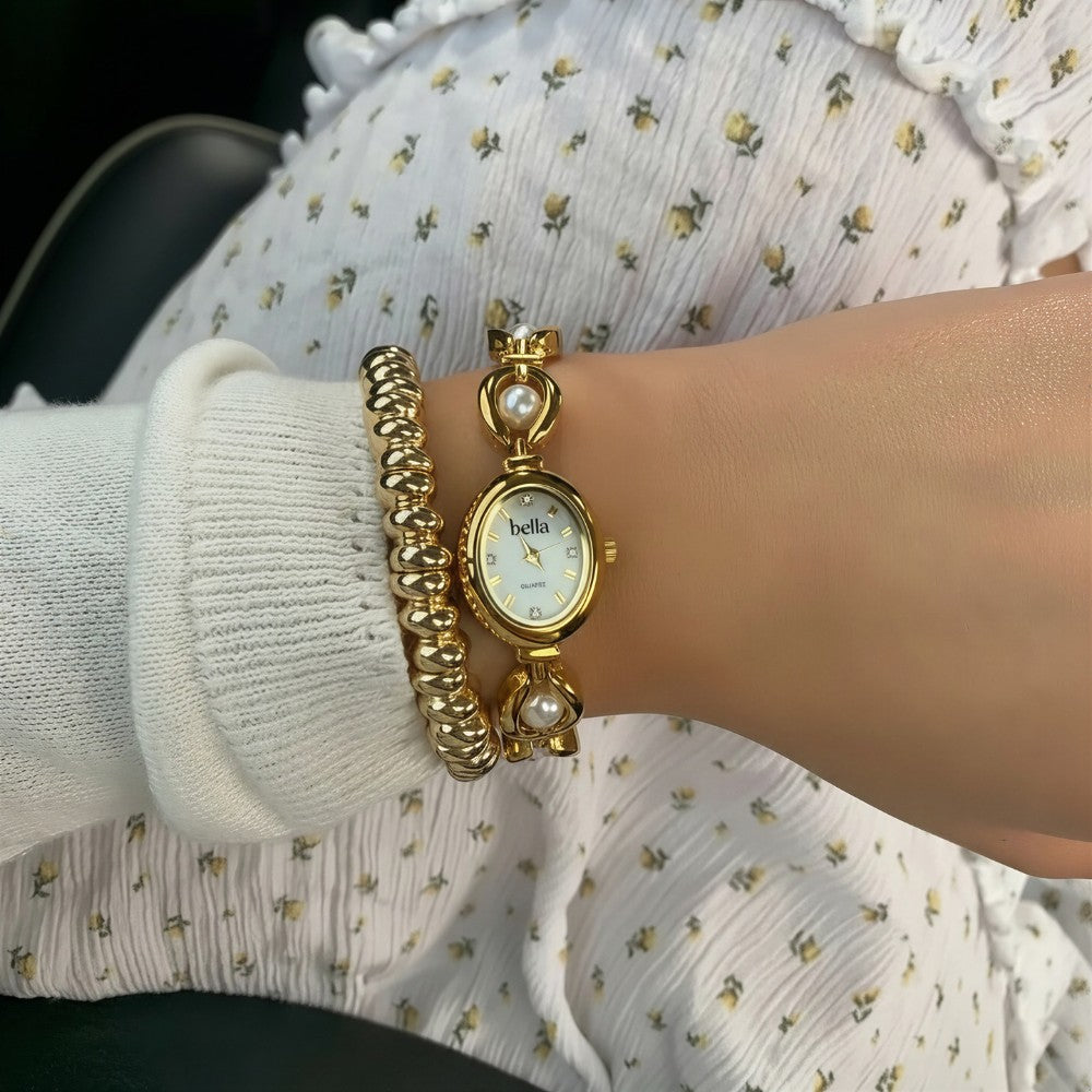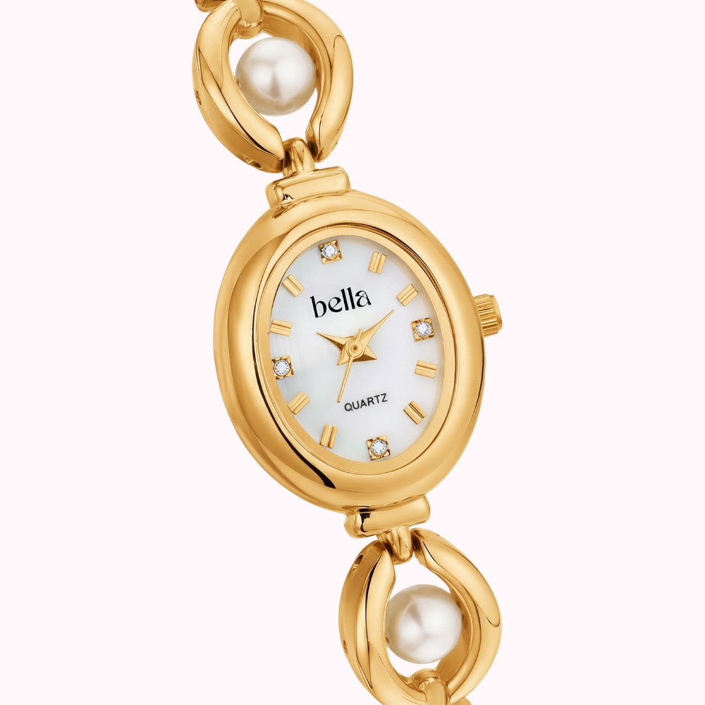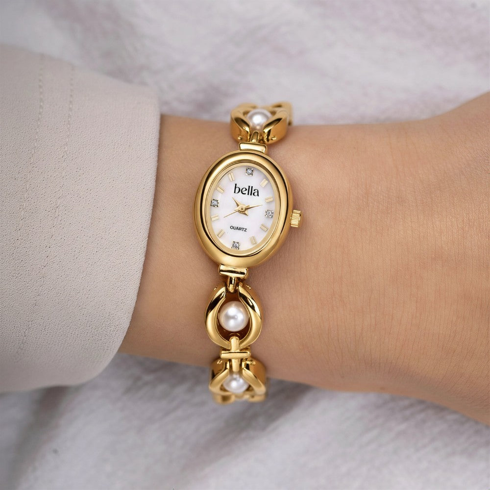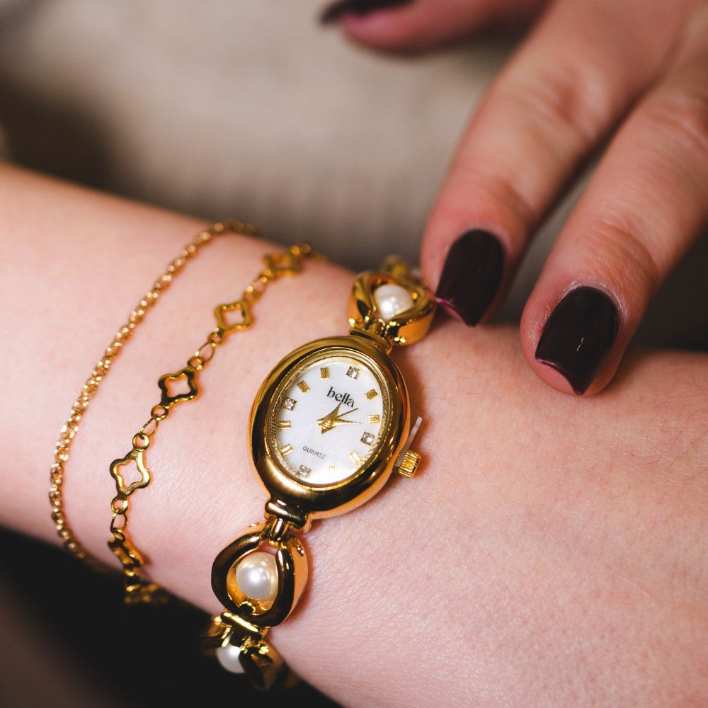 A Bella Amalfi egy gyöngyökkel díszített, finom vintage stílusú női óra, amely a csendes luxus érzetét hozza el megfizethető formában. A klasszikus számlap és a gyöngyházfényű részletek időtlen nőiességet sugallnak – nem kell túlzás, elég a jelenléted!